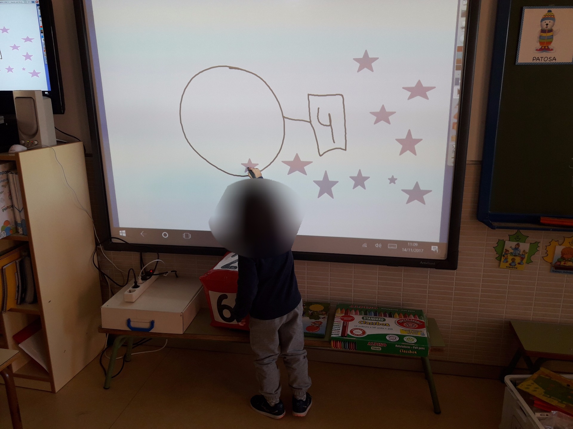 Una vez realizado el dibujo, se le da al niño el lápiz de la pantalla digital y arrastran el número de estrellas deseado al centro del círculo.