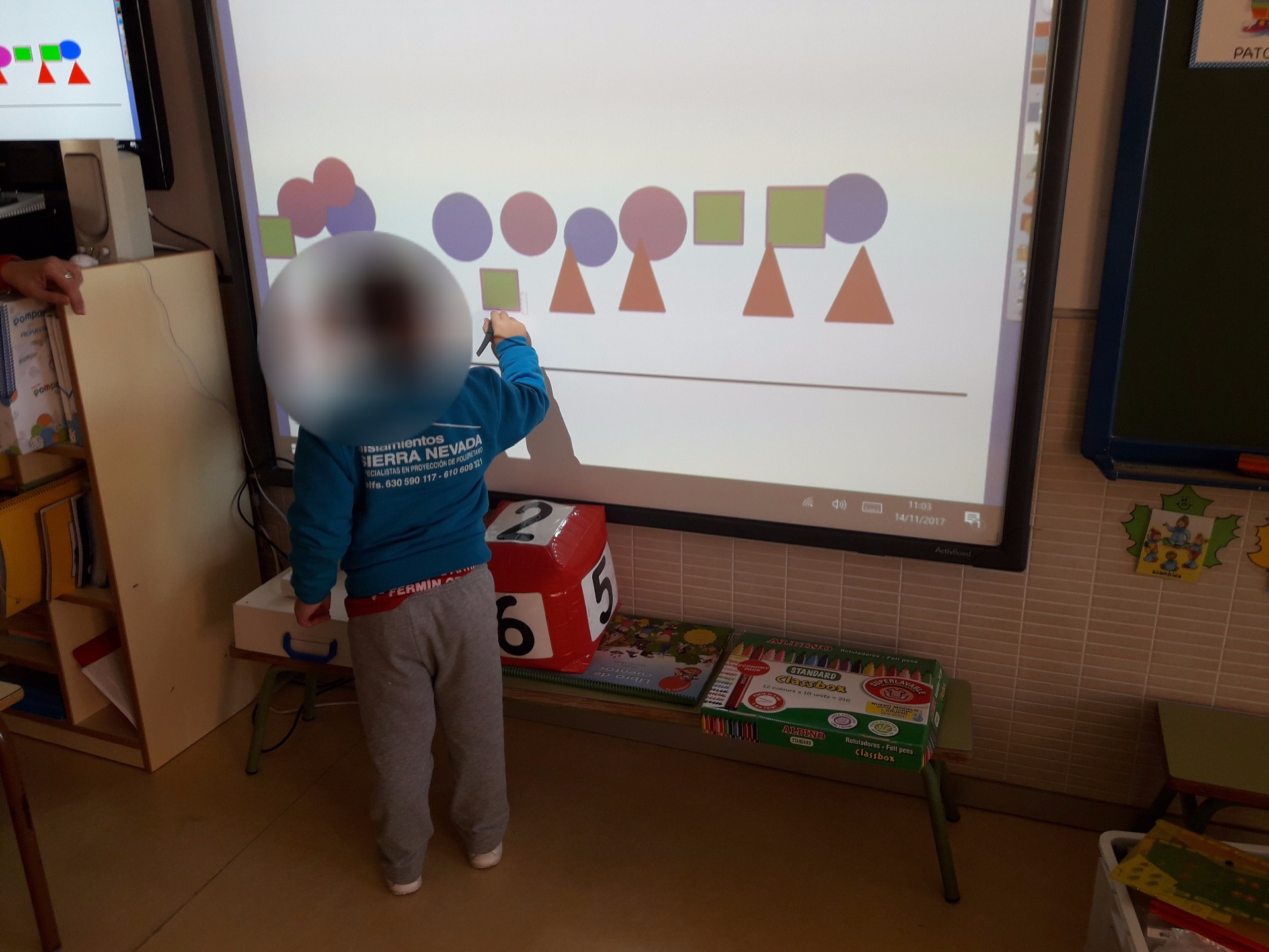 Le damos al niño el lápiz en la opción "señalar" y deben arrastrar cada figura geométrica hasta el lugar que corresponda.