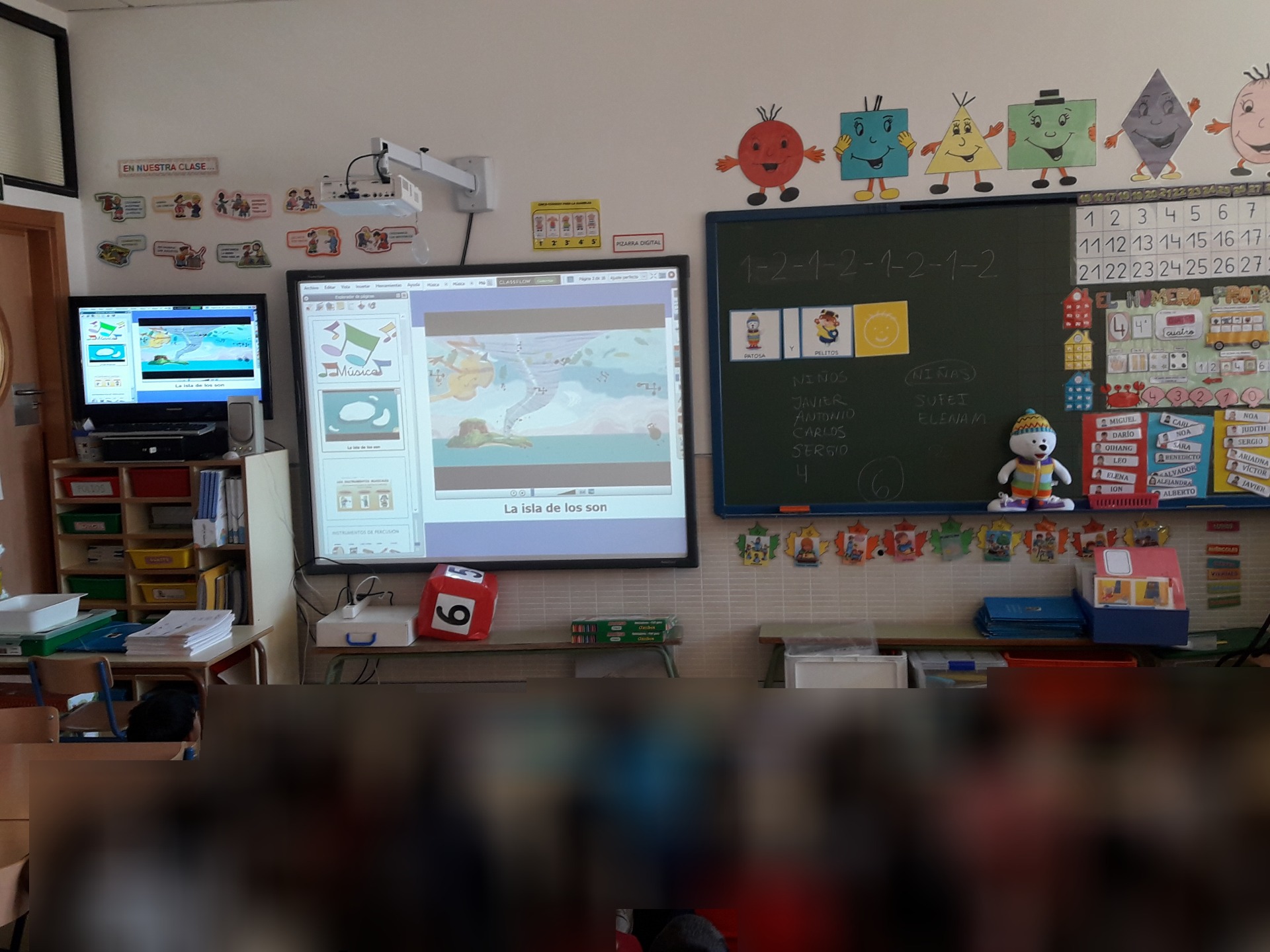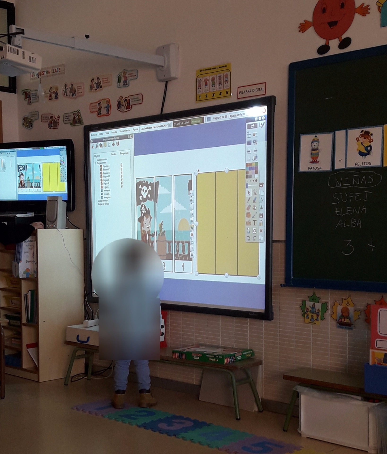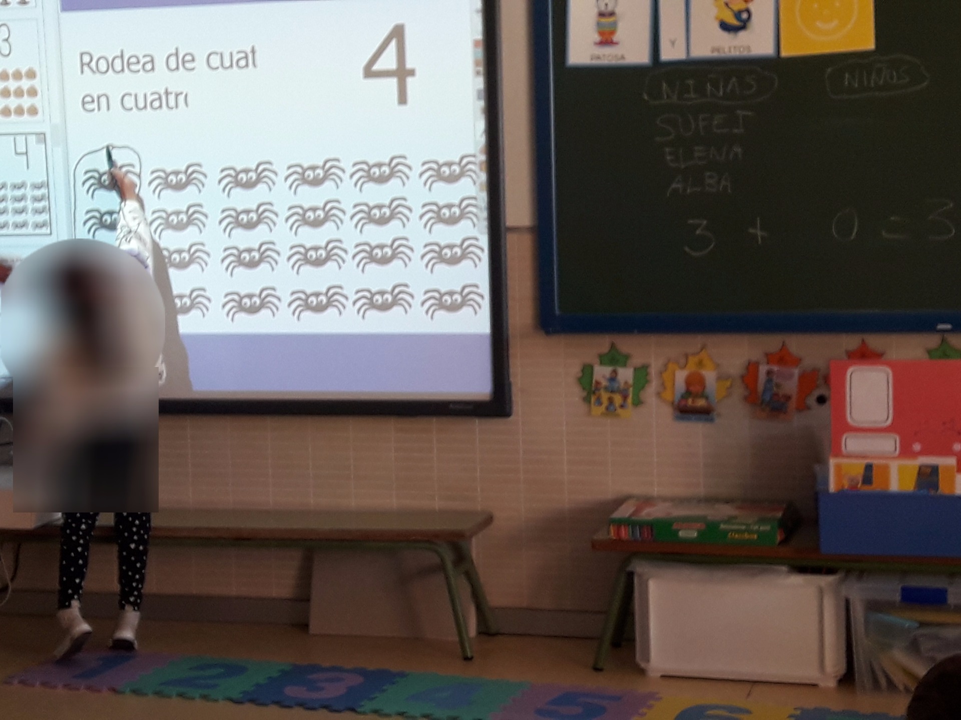 Con una pantalla ya proyectada, los alumnos deben rodear de cuatro en cuatro, se le ofrece el lápiz de la pantalla y pulsan la opción "escribir" de esta manera el lápiz pinta y pueden rodear lo que se les pregunte.